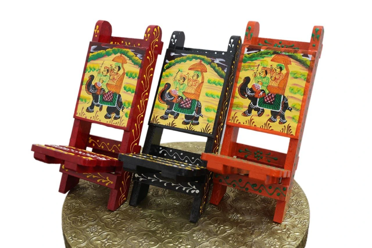 Add a touch of heritage and functionality to your space with this Hand-Painted Wooden Foldable Mobile Stand Chair. Skillfully made from premium wood and adorned with an traditional hand-painting work featuring a regal elephant motif, this stand is as artistic as it is practical.