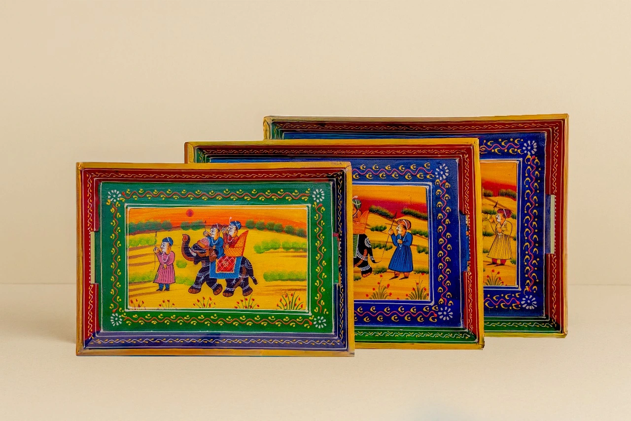 Rooted deeply in the cultural heritage of Rajasthan, this wooden tray set is a tribute to skilled craftsmanship and traditional culture. The natural strength of wood ensures durability, while the ethnic painting work elevate its aesthetic appeal—making it a perfect addition to both classic and contemporary interiors.
